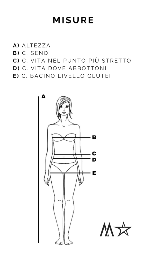 Innanzitutto abbiamo bisogno di sapere le tue misure. Utilizza un metro da sarta e prendi le seguenti misure: