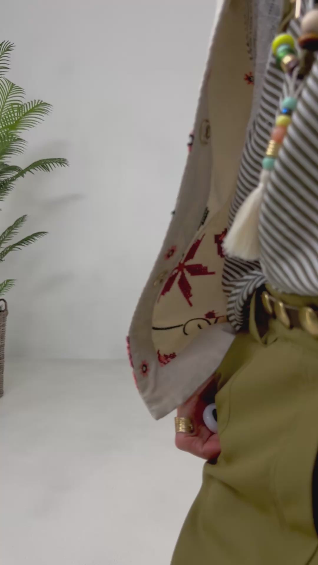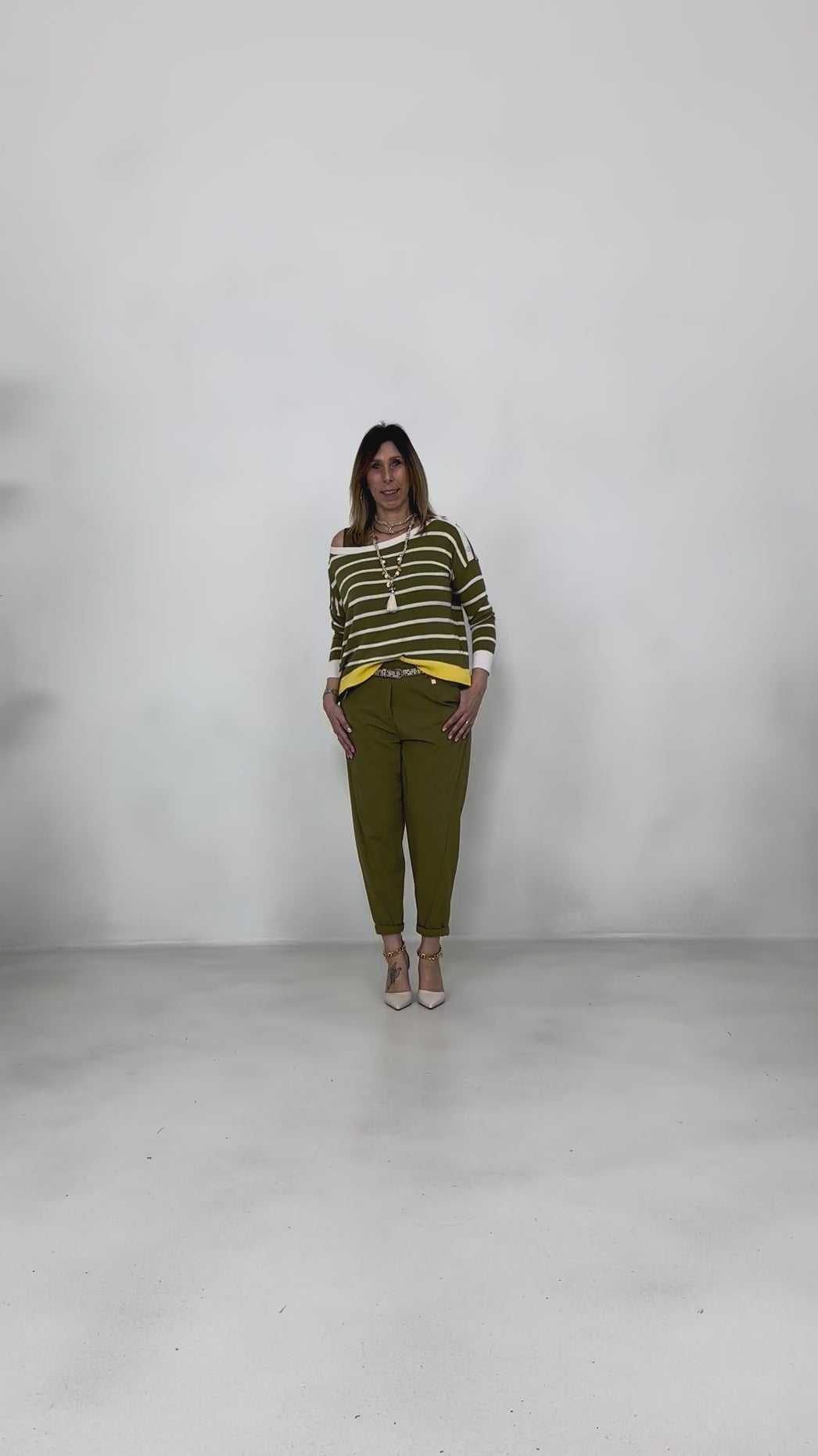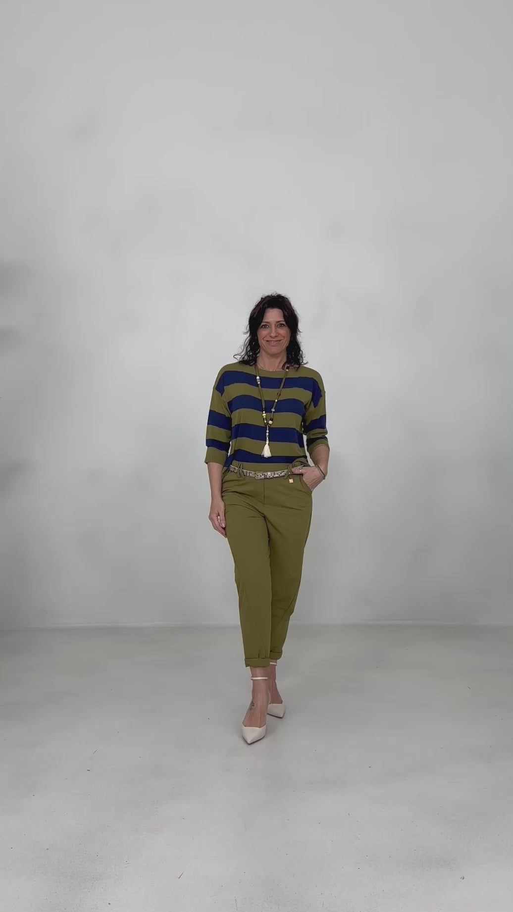 In vita, la fascetta con elastico interno e passanti doppi assicura comfort e libertà, impreziosita da una placchetta dorata sul lato sinistro.