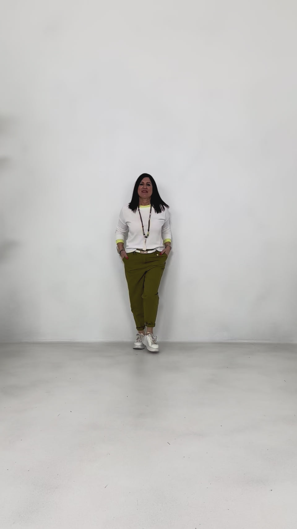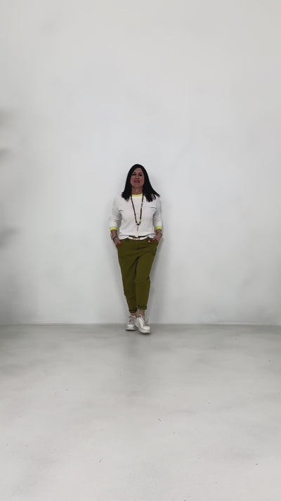 La linea è morbida ma curata nei dettagli: la patta frontale con piega e le pinces in vita definiscono la silhouette, mentre la cucitura del fianco che ruota in avanti e la tasca obliqua aggiungono un carattere deciso e contemporaneo.