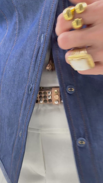La chiusura con bottoncini ricoperti, illuminati da anellini dorati, aggiunge un dettaglio prezioso dal gusto rock raffinato.