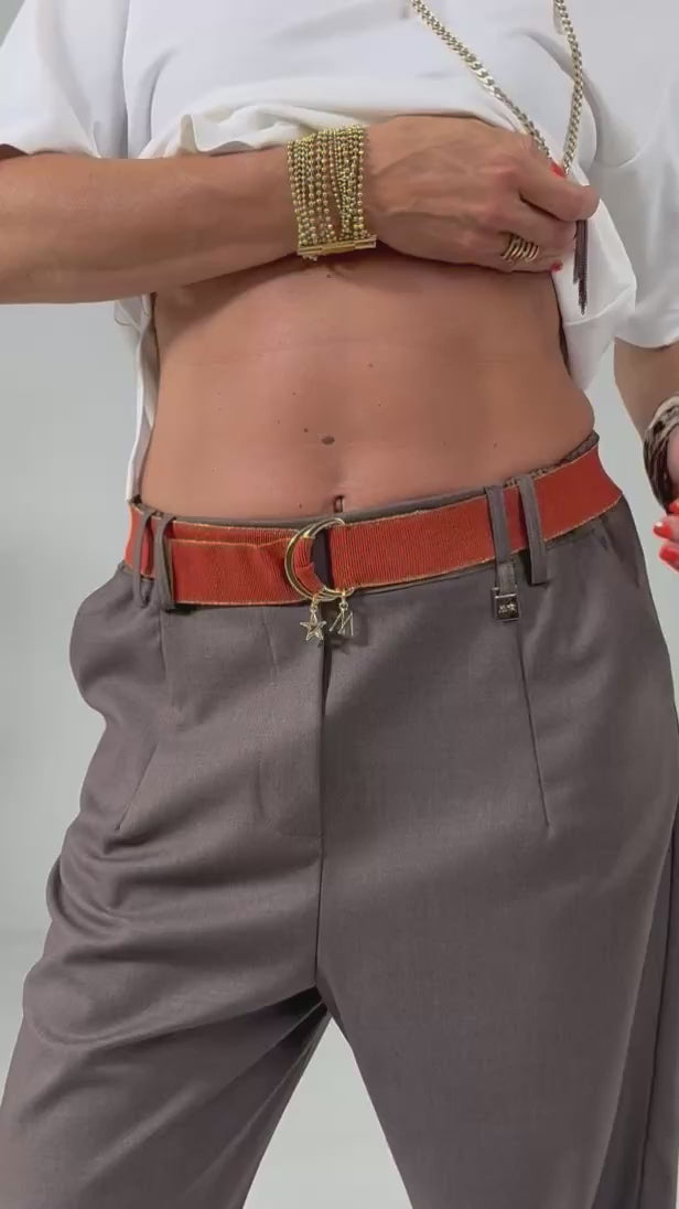 Cintura elastica alta 3,6 cm (elastico morbido) molto comoda e confortevole, accompagna i movimenti ed arricchisce il look donandogli grinta! Chiusura con fibbia dorata impreziosita da pendenti logo ed estremità in metallo.