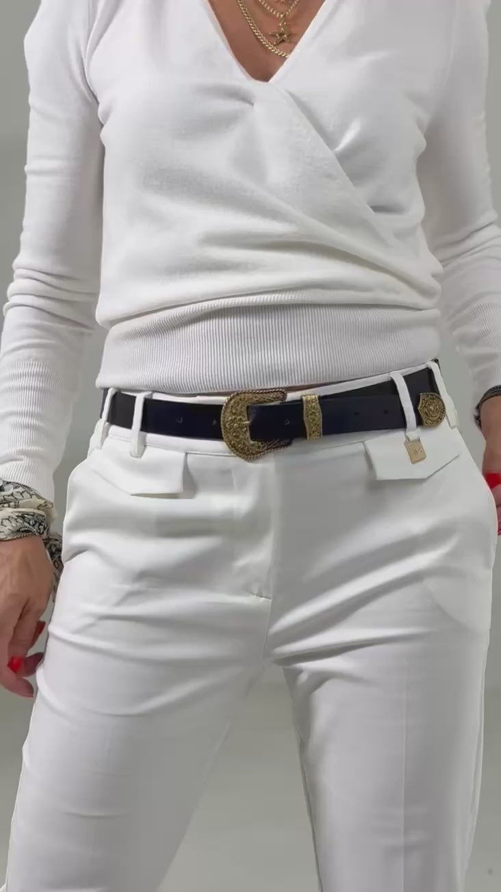 Cintura in vera pelle, alta 3 cm con trittico in metallo oro vecchio.