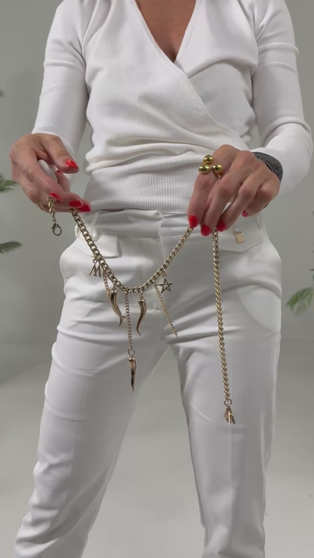 La catena è lunga in totale 55 cm escluso il moschettone di chiusura, al suo estremo abbiamo applicato i pendenti del nostro logo, sempre nel colore oro, per rendere questo accessorio ancora più esclusivo