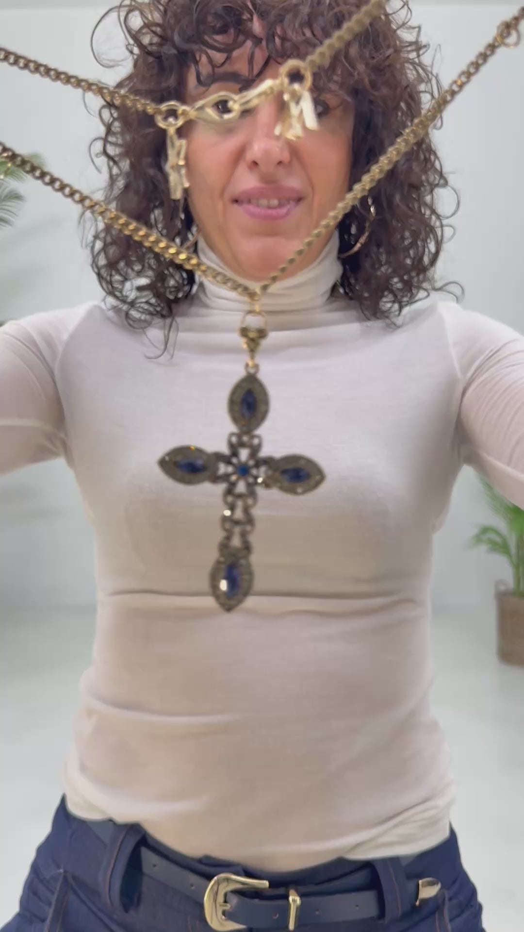 La catena brunita in lega di zinco sostiene una croce di 7 cm, impreziosita da cristalli color rubino o zaffiro.