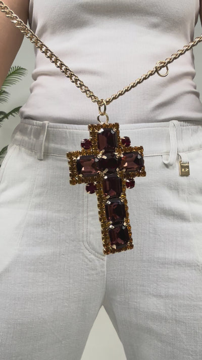 Al centro, una croce luminosa impreziosita da pietre grandi e brillanti cattura lo sguardo con un’eleganza audace, mentre la chiusura con moschettoni e i charms dorati logati aggiungono un dettaglio grintoso e distintivo.