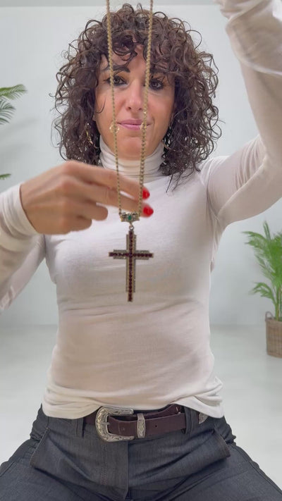 La croce allungata con cristalli rossi, montata su catena brunita in lega di zinco, esprime un’eleganza pulita ma intensa.