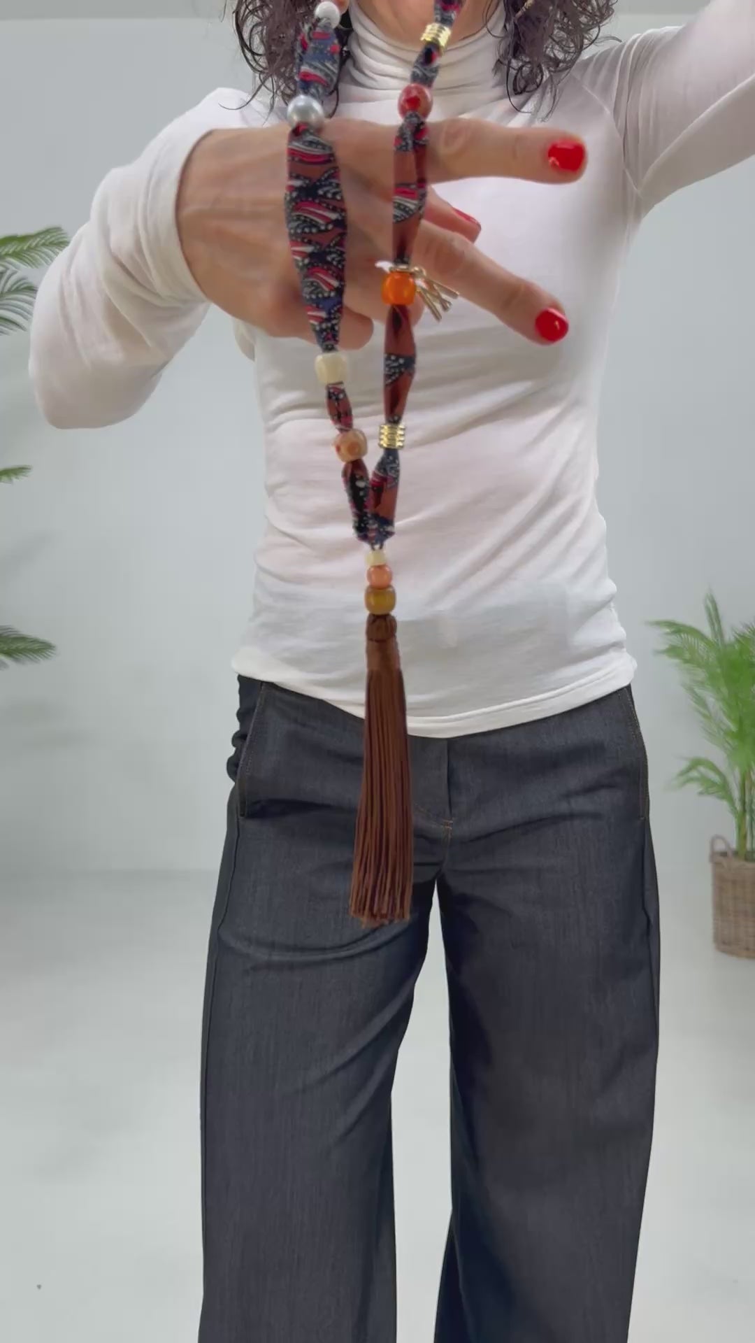 Realizzata in tessuto di viscosa a fantasia con taglio al vivo, arricchita da pietre in legno, acrilico e metallo, si distingue per i dettagli dorati dell’aggancio e per la nappa in viscosa che ne completa il design con movimento e personalità.