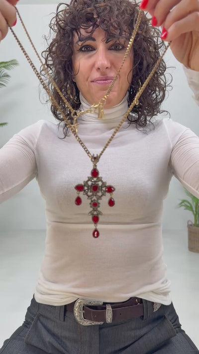 La catena brunita in lega di zinco – un materiale resistente e durevole che unisce zinco, alluminio e rame – sostiene la croce pendente lavorato con pietre color rubino o zaffiro.