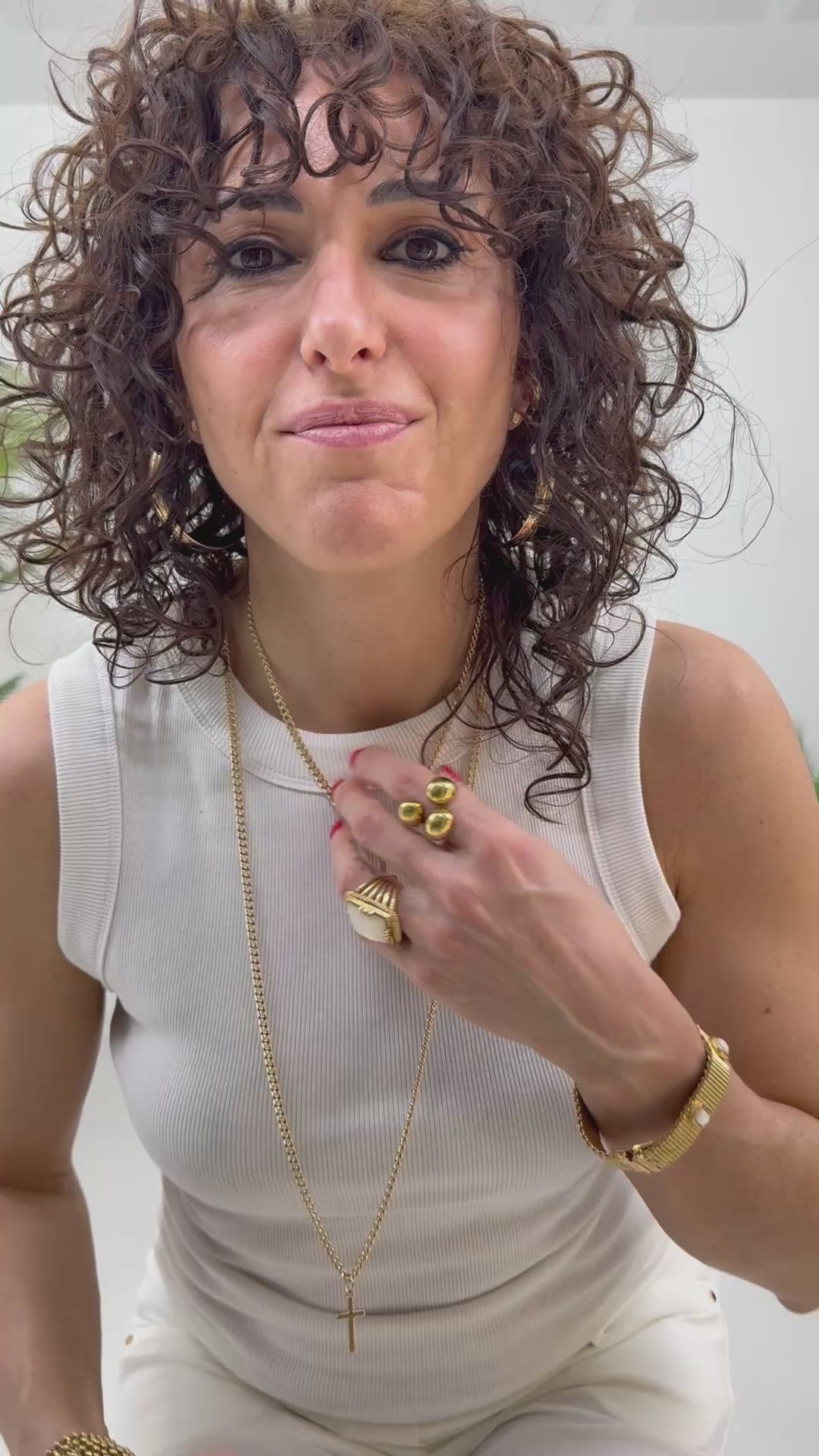 Maglia sottile che accarezza il décolleté e piccoli pendenti a croce.