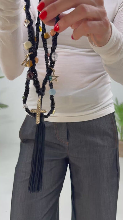 Le pietre in vetro, acrilico, legno e metallo donano movimento e colore, mentre la nappa in viscosa aggiunge quel tocco boho-chic che si sposa perfettamente con lo stile casual chic rock di La Mora Glamour.