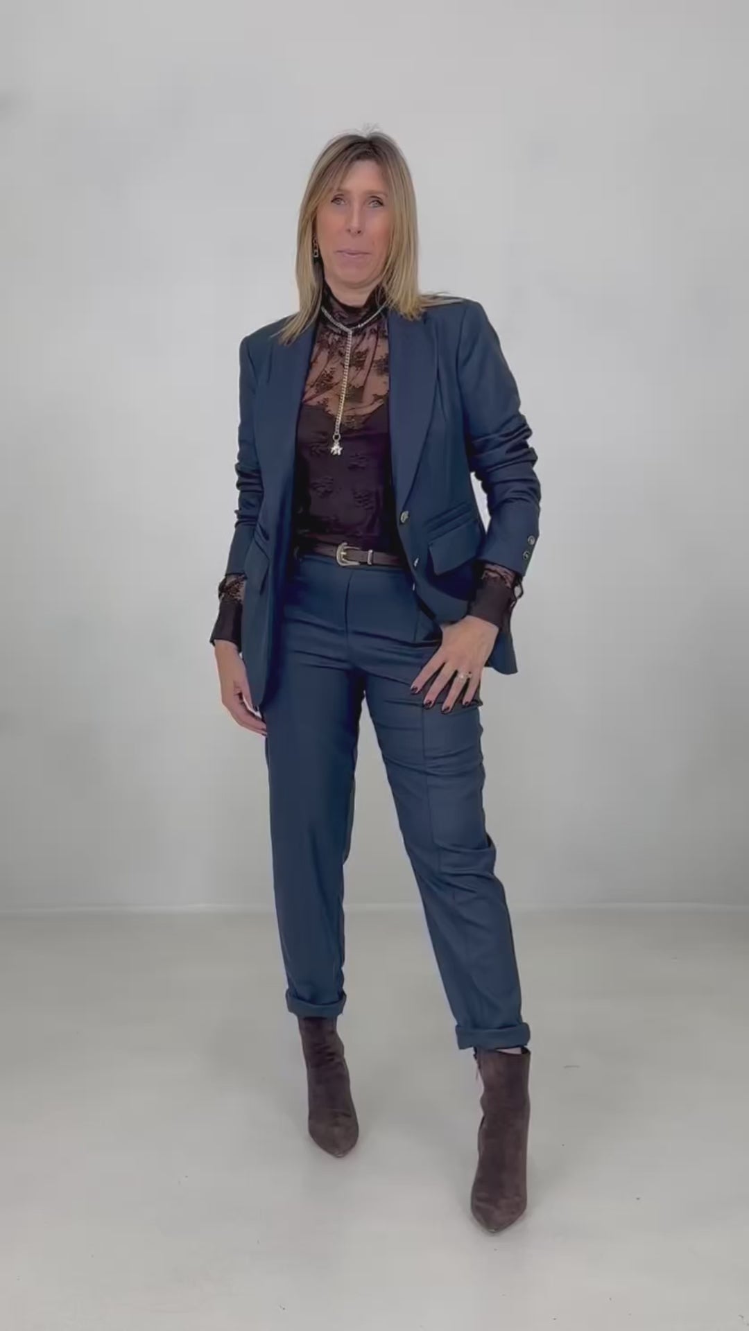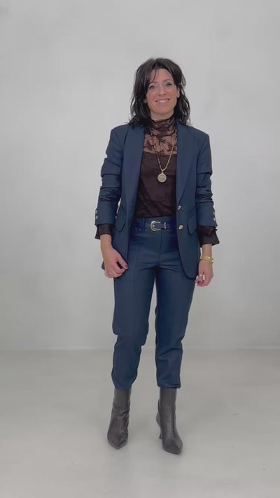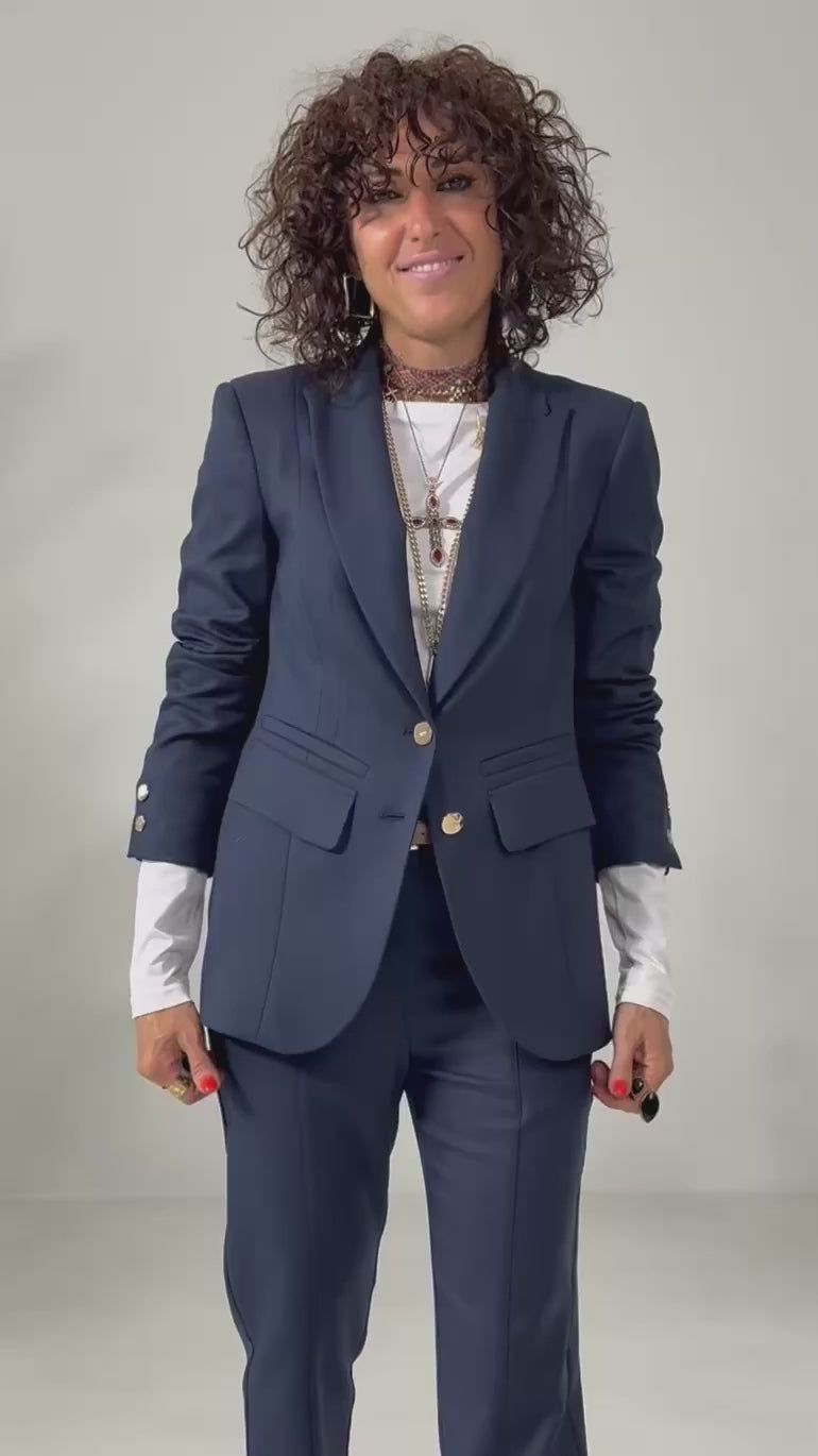 Abbottonatura monopetto con bottoni oro grandi e laserati.