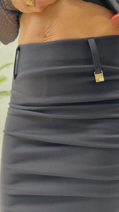Pieghe sul lato sx indossato, che creano un arriccio, movimentando la gonna.