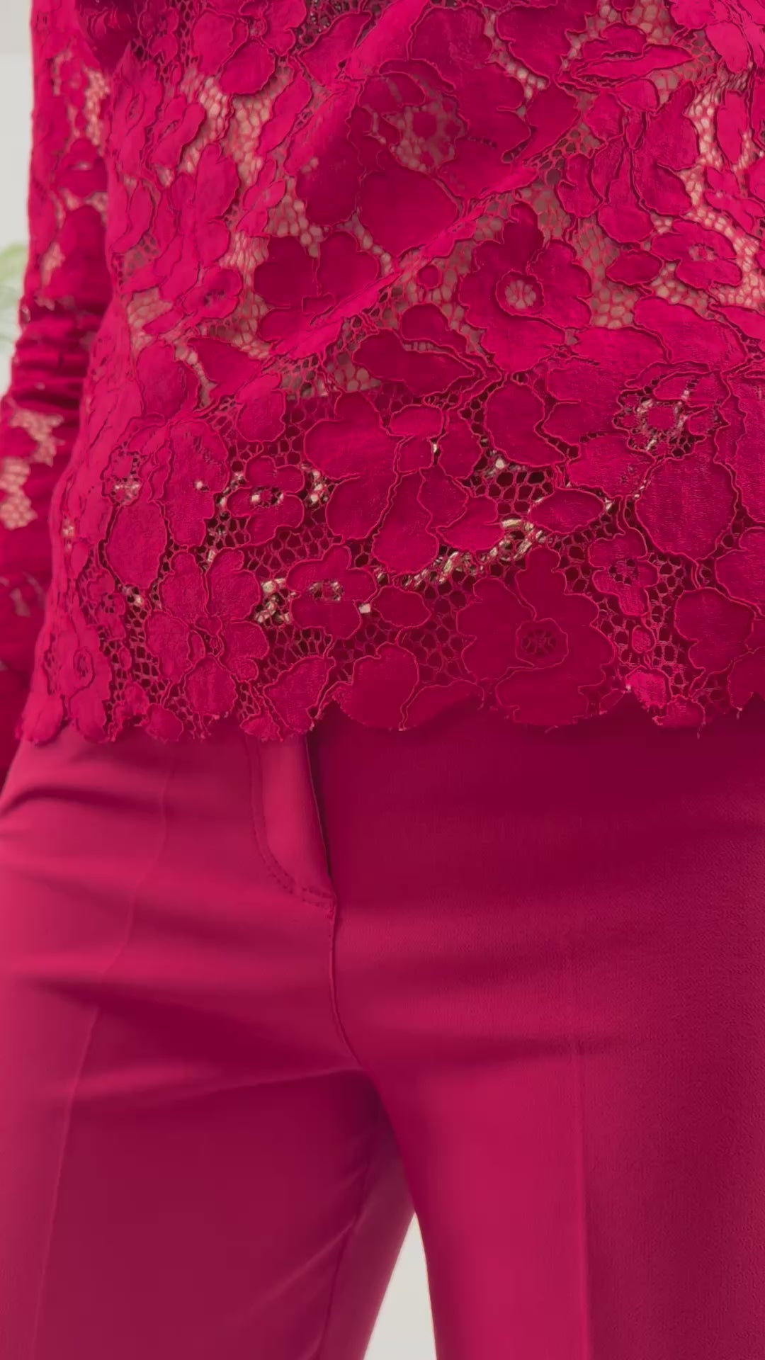 Maglia in pizzo con scollo a V incrociato con cappe al vivo.