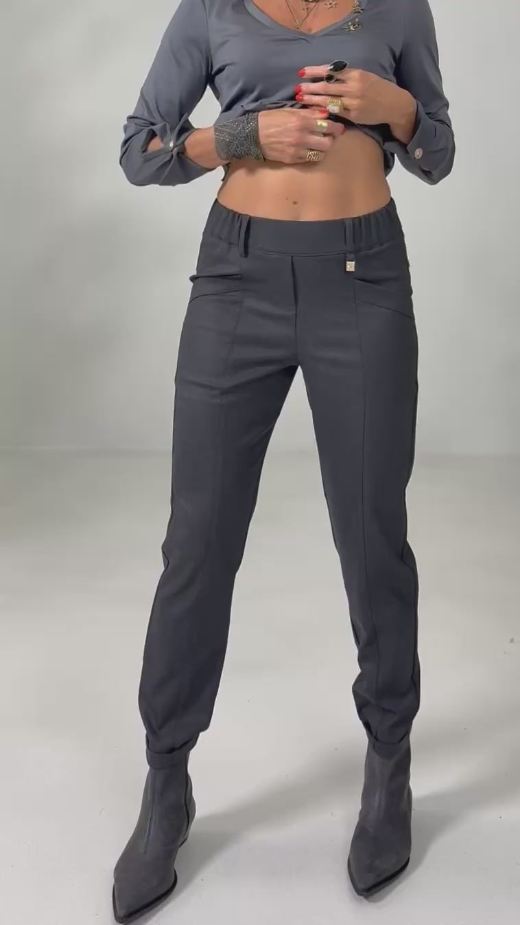 Lo chiamiamo Easy pant per la comodità e praticità, infatti non presenta zip o bottoni, ma elastico all'interno della fascetta.