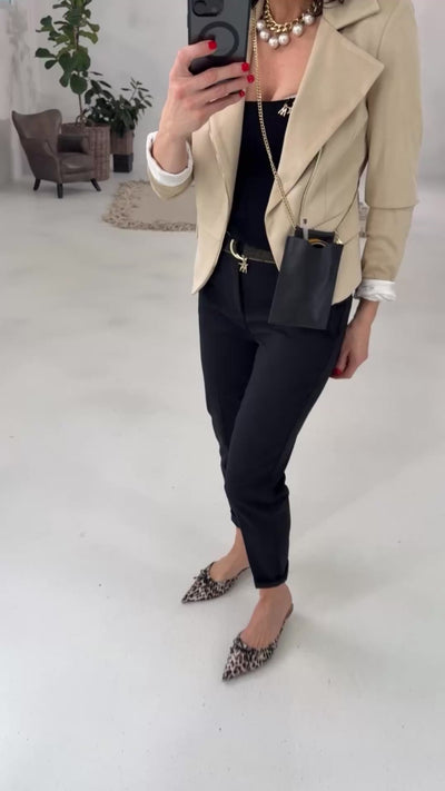 Ampia tasca per contenere lo smartphone e taschina porta tessere posteriore.