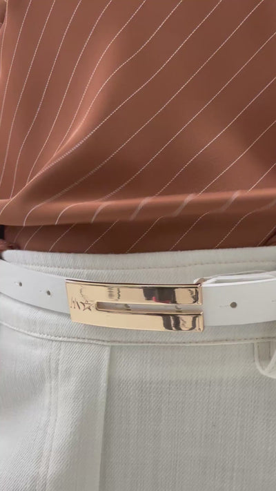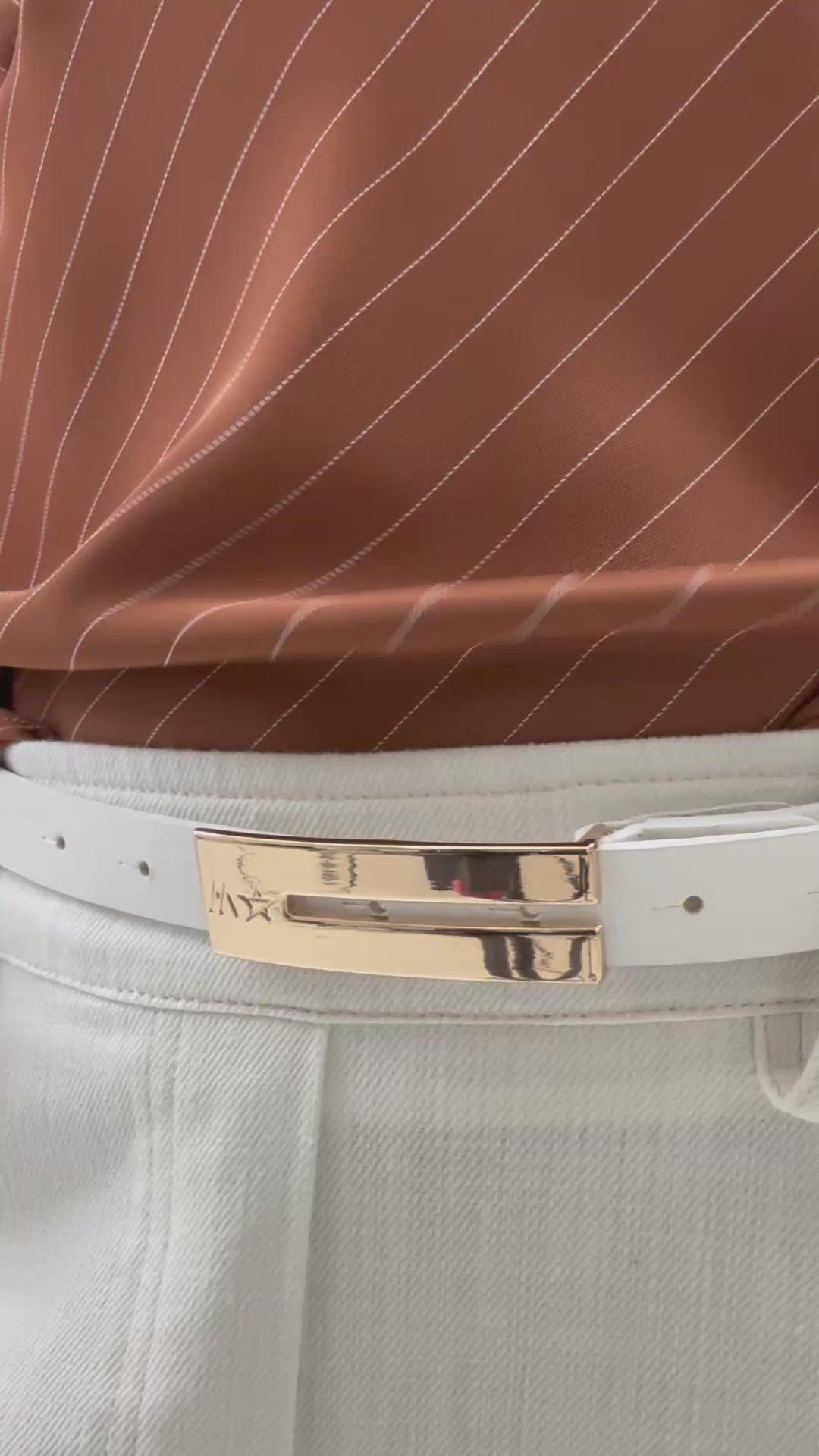 Top in cady fluido gessato, morbido al tatto e con quel movimento leggero che sfiora la pelle con eleganza.