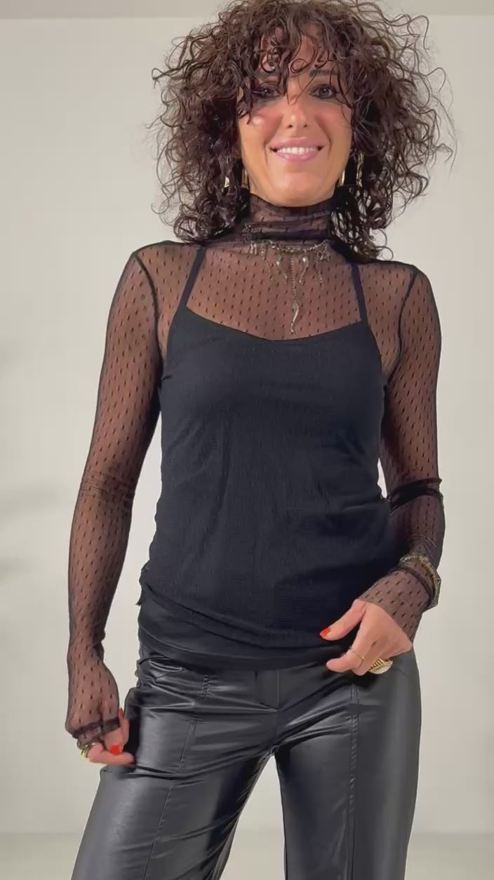 Tween-set composto da t-shirt a manica lunga in tessuto retina a pois e top in jersey di viscosa con spalline sottili ed incrociate nella parte posteriore.